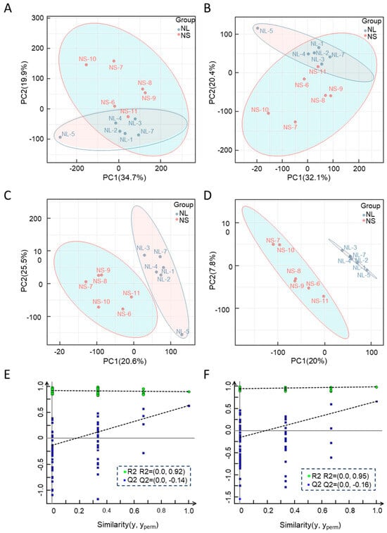 To explore the metabolomic differences between the NL and NS groups, a principal component analysis (PCA) and partial least squares-discriminant analysis (PLS-DA) were conducted on the LC–MS/MS metabolomic data. PCA score plots in both positive and negative ion modes demonstrated a clear separation between the NL and NS groups (Figure 2A,B). This separation was further confirmed by orthogonal projections to latent structures discriminant analysis (OPLS-DA), which revealed distinct metabolite profiles between the two groups despite their shared environment (Figure 2C,D). The OPLS-DA model exhibited high predictability. In the positive and negative ion modes, the R2 values reached 0.627 and 0.657, respectively. Furthermore, when examining the regression line, its intersection points with the ordinate at the Q2 point were determined to be −0.14 and −0.16, as clearly shown in Figure 2E,F. These findings strongly attest to the model’s robustness and validate its appropriateness for subsequent in-depth analysis.
