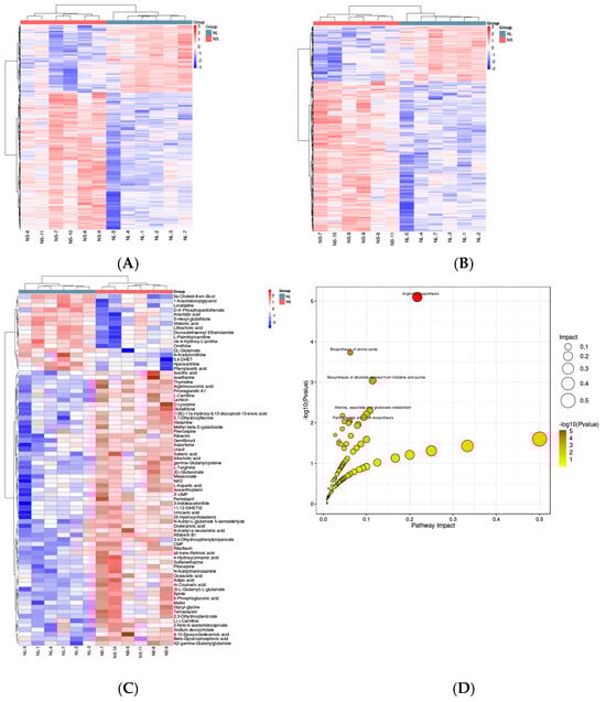 The raw mass spectrometry data (.raw files) were processed via Compound Discoverer 3.1.0 (Thermo, Waltham, MA, USA) for peak extraction, retention time correction, adduct ion merging, gap filling, background peak labeling and metabolite identification. Each ion was characterized on the basis of retention time and m/z values, with recorded peak intensities, molecular weights, retention times, peak areas and identification results. The metabolites were annotated by matching the exact molecular mass, name and formula to the KEGG and HMDB databases, allowing for a mass difference of less than 10 ppm. The data analyses included a principal component analysis (PCA) and partial least squares-discriminant analysis (PLS-DA). The differential metabolite abundance between the NL and NS groups was assessed via Student’s t test, with the p values adjusted for the false discovery rate (FDR). Supervised PLS-DA with metaX and variable importance in projection (VIP) values was used to distinguish group variables. Differentially abundant metabolites (DMs) were identified on the basis of fold changes (≥2 or ≤0.5), p values (≤0.05) and VIP values (≥1). Further analyses of the DMs were conducted via MetaboAnalyst 5.0 and the KEGG database.
