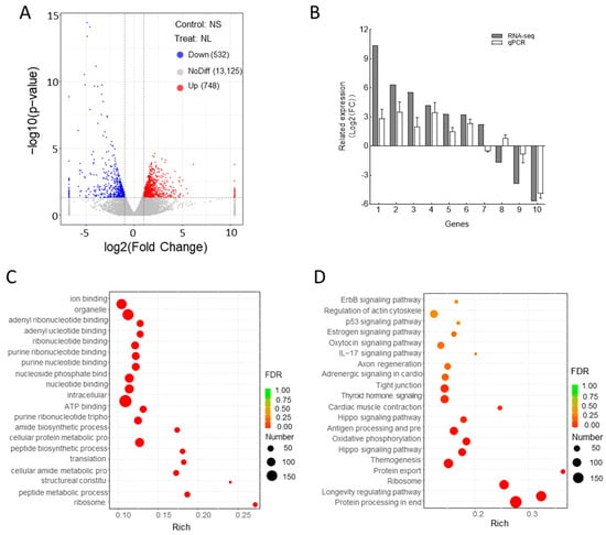 A transcriptomic analysis revealed 1280 significantly differentially expressed genes (DEGs), with 748 genes upregulated and 532 genes downregulated in the NL group compared with the NS group (Table S4, Figure 4A). The reliability of the transcriptomic data was validated via qPCR, which confirmed the expression patterns of ten randomly selected DEGs (Figure 4B). A Gene Ontology (GO) enrichment analysis revealed that the most enriched terms in the CC category were related to ribosomes, whereas the MF category was dominated by structural constituents of ribosomes. In the biological process (BP) category, the predominant terms included peptide metabolism, cellular amide metabolism, and translation (Figure 4C).