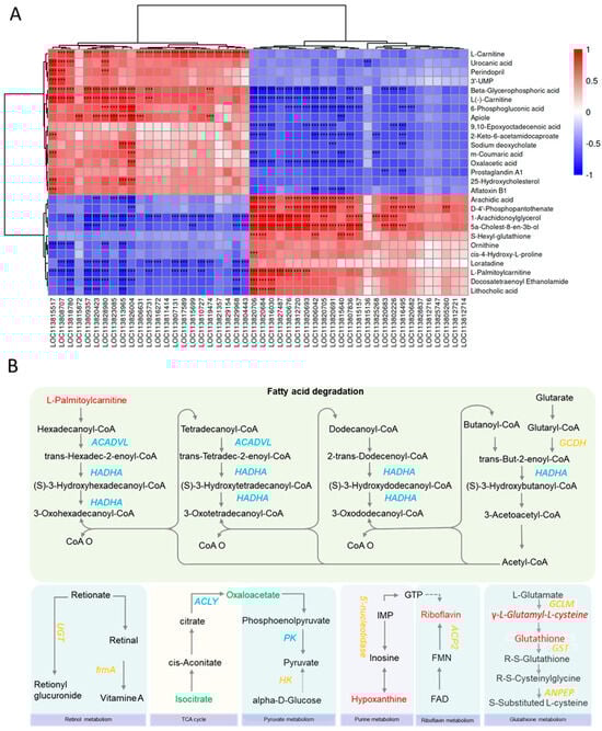 A Spearman correlation analysis was performed to integrate the transcriptomic and metabolomic data, revealing a strong correlation between the DEGs and DMs, and some of the results are presented in Figure 5A (Supplementary Table S5 and Figure S1). The KEGG pathway analysis of the integrated data revealed several key pathways influencing growth performance, including fatty acid degradation, retinol metabolism, the TCA cycle, glutathione metabolism, riboflavin metabolism, and purine metabolism (Figure 5B).