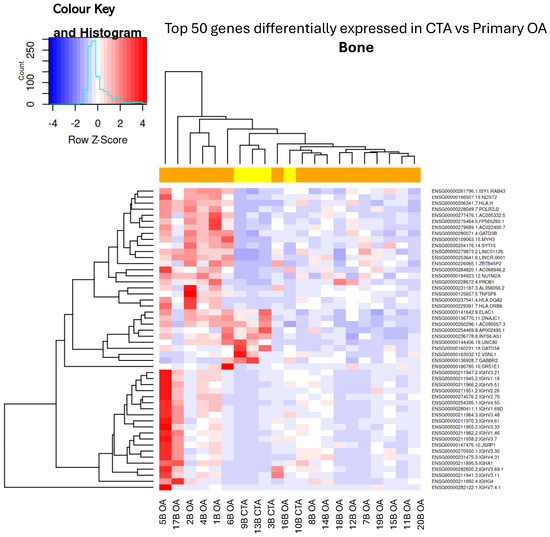 Hierarchical unsupervised clustering (not ordered prior to analysis; genes and samples are positioned based on their observed similarity) gene expression heatmap and colour histogram. Top 50 DEGs in CTA compared with shoulder OA. Bone biopsies for patients 1 through to 20. B = bone, OA = OA, CTA = cuff-tear arthropathy.