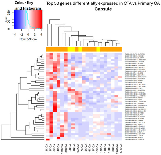 Hierarchical unsupervised clustering (not ordered prior to analysis; genes and samples are positioned based on their observed similarity) gene expression heatmap and colour histogram. Top 50 DEGs in CTA compared with shoulder OA. Capsular tissue biopsies for patients 1 through to 20. C = capsule, OA = OA, CTA = cuff-tear arthropathy.