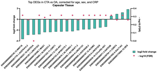 Top DEGs in capsular tissue for patients with CTA compared to primary OA, corrected for age, sex, and CRP.