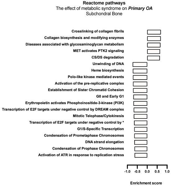 Biological enrichment processes in primary OA demonstrating the effect of MetS in subchondral bone biopsies. * Transcription of E2F targets under negative control by p107 (RBL1) and p130 (RBL2) in complex with HDAC1.