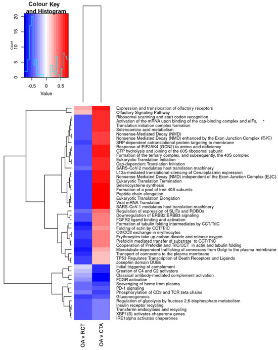 Differential pathway regulation in primary shoulder OA, RCT, and cuff-tear arthropathy (CTA). * Activation of the mRNA upon binding of the cap-binding complex and eIFs, and subsequent binding to 43S. The heatmap displays significantly enriched pathways across tissue comparisons: OA vs. RC (first column, OA v RCT) and CTA vs. OA (second column, OA v CTA). The colour scale represents the extent of pathway upregulation (red) or downregulation (blue), with the histogram in the top left corner showing the distribution of values.