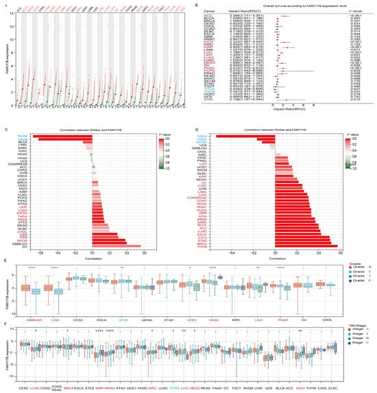Evaluation of the prognostic value and clinical significance of FAM111B. (A) Differential expression of FAM111B between tumor (T) and normal (N) tissue in 31 cancer types. MESO and UVM were excluded due to the absence of corresponding healthy control samples. (B) Survival analysis based on FAM111B expression. (C) Correlation between FAM111B expression and DNA expression-based stemness score (DNAss). (D) Correlation between FAM111B expression and RNA expression-based stemness score (RNAss). (E) Association between FAM111B expression and pathological grade. (F) Relationship between FAM111B expression and TNM stage. Data were obtained from TCGA and GTEx databases. Red font indicates cancers with elevated FAM111B expression and blue font indicates cancers with reduced FAM111B expression. Statistical significance was established at a threshold of p < 0.05, with the following designations: * for p < 0.05, ** for p < 0.01, and **** for p < 0.0001.