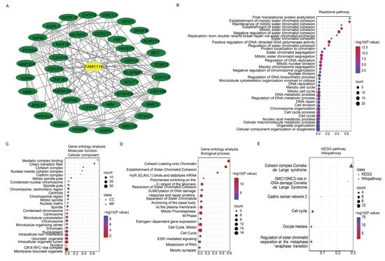 Protein–protein interaction (PPI) network and enrichment analysis pertaining to FAM111B and co-expressed genes. (A) PPI network involving FAM111B and 40 associated genes. (B–E) Enrichment analysis of FAM111B and its related genes, utilizing the Reactome Pathway (panel B), Gene Ontology (GO) (panels C,D), Kyoto Encyclopedia of Genes and Genomes (KEGG), and WikiPathways (panel E) databases.