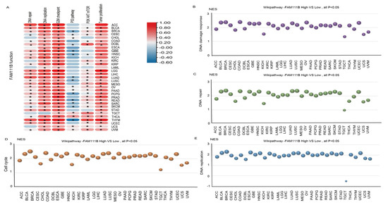 Involvement of FAM111B in the DNA repair pathway. (A) The functional pathway of FAM111B according to ssGSEA analysis of TCGA data. (B–E) Roles of FAM111B in the DNA damage response, DNA repair, cell-cycle regulation, and DNA replication pathways. GSEA analysis of high and low FAM111B expression groups was performed using Wikipathway.