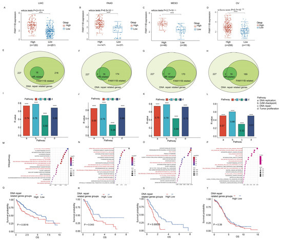 FAM111B’s role in DNA repair across LIHC, PAAD, MESO, and OV. (A–D) FAM111B expression in high/low DNA repair gene groups. (E–H) Venn diagram analysis of FAM111B expression among 227 DNA repair–related genes (light green). The numbers of genes with high FAM111B expression (medium green) and those that are homologous recombination (HR) repair genes (dark green) are shown. (I–L) ssGSEA enrichment of FAM111B expression in four cancer-associated pathways. (M–P) GSEA enrichment of FAM111B in the Wikipathway database. Pathways associated with DNA damage response are indicated in red. (G–T) Kaplan–Meier analysis of DNA repair gene expression in LIHC, PAAD, MESO, and OV. Statistical significance was established at a threshold of p < 0.05, with the following designations: **** for p < 0.0001.
