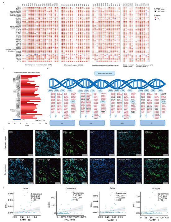 The positive correlation between FAM111B and genes involved in DNA repair. (A) The positive correlation between FAM111B and sets of genes associated with specific DNA damage processes. Correlations were evaluated according to tumor type using data in TCGA and GTEx databases. (B) The correlation between FAM111B and BRCA1 across various cancer types. (C) The correlation between FAM111B and DNA repair genes specifically within LIHC, PAAD, MESO, and OV. (D) Representative images of FAM111B and BRCA1 immunofluorescence staining in PC and adjacent tissues. (E) The correlation between FAM111B and BRCA1 across the area (image section), cell count (number of positive cells), H-score (immunofluorescence assessment), and ratio (number of positive cells divided by the total cells). The H-score was calculated as ((intensity of 1 + cell positive rate) × 1 + (intensity of 2 + cell positive rate) × 2 + (intensity of 3 + cell positive rate) × 3) × 100.
