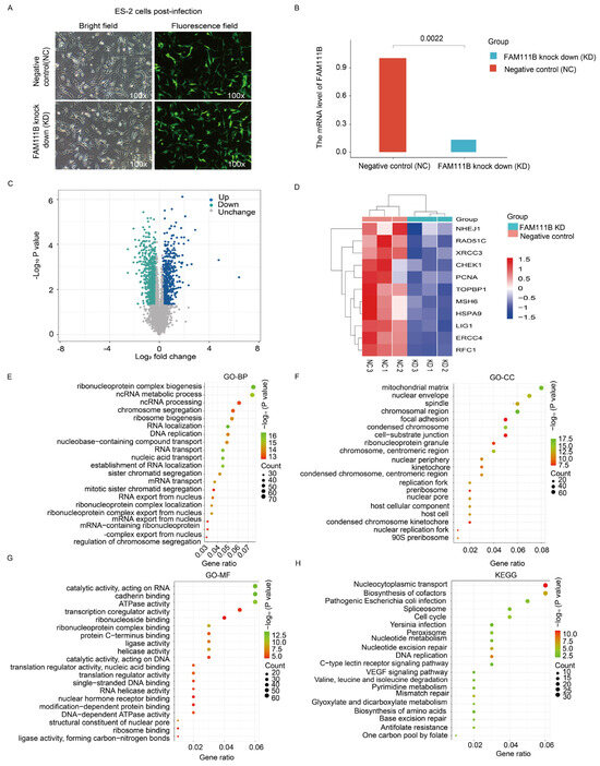 Transcriptomic analysis of FAM111B knockdown cells. (A) Fluorescence image of ES-2 cells infected with a negative control siRNA (NC) or FAM111B knockdown siRNA (KD). (B) qPCR detection of FAM111B levels in infected cells. (C) Volcano plot of gene expression changes in NC versus KD cells. (D) Heat map of differentially expressed DNA repair genes. (E–H) Enrichment analysis of differentially expressed genes in GO (BP, biological processes; CC, cellular component; MF, molecular function) and KEGG databases.