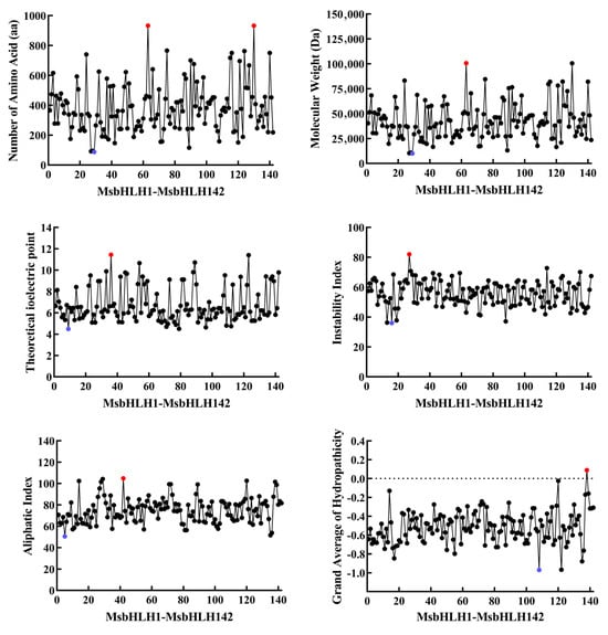 Physicochemical properties of 142 MsbHLH proteins. Maximum values were indicated by red dots and minimum values by blue dots in each figure.