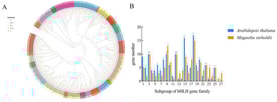 bHLH TFs are present in all eukaryotes and are one of the largest families of transcription factors found in plants. Over the past two decades, bHLH TFs have been identified and characterized in a wide range of plant species, such as rice (183 OsbHLHs) [], maize (231 ZmbHLHs) [], rye (220 ScbHLHs) [], and barley (103 HvbHLHs) [] belonging to the monocots in angiosperms, and kale-type oilseed rape (602 BnabHLHs) [], tomato (159 SlbHLHs) [], Arabidopsis thaliana (162 AtbHLHs) [], sweet orange (135 CsbHLHs) [], passion fruit (138 PebHLHs) [], Mongolian oak (89 QmbHLHs) [], etc. The number of bHLH genes varies among species. Although bHLH has been identified in several species, the identification and characterization of bHLH in magnolias, which are located in the key position of evolutionary classification, have not yet been reported.