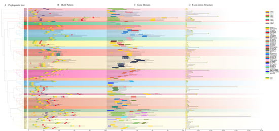 Phylogenetic relationships, conserved motifs, contained structural domains, and gene structures of MsbHLHs: (A) Phylogenetic tree of MsbHLH proteins. (B) Distribution of conserved motifs in MsbHLH proteins. A total of 10 motifs were detected and the scale bar indicates 200 aa. (C) Distribution of structural domains in MsbHLHs. (D) Gene structures of MsbHLHs.