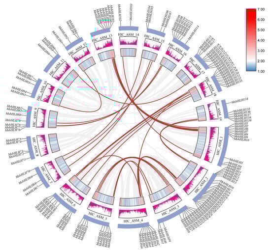 Distribution and collinearity of MsbHLHs in the M. sieboldii chromosomes. The red lines represent the collinearity between MsbHLH genes. The blue boxes represent the M. sieboldii chromosomes. The two boxes inside each chromosome represent its gene density.