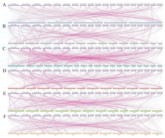 Collinearity of bHLH genes between MsbHLH and 6 other species. Gray lines represent collinearity between MsbHLH and other genomes in each plant. Pink lines represent collinearity between bHLH genes. Each box represents the corresponding chromosome: (A–F) represent collinearity between MsbHLH and Arabidopsis thaliana, blue-starred waterlily, poplar, tomato, rice, and maize, respectively.