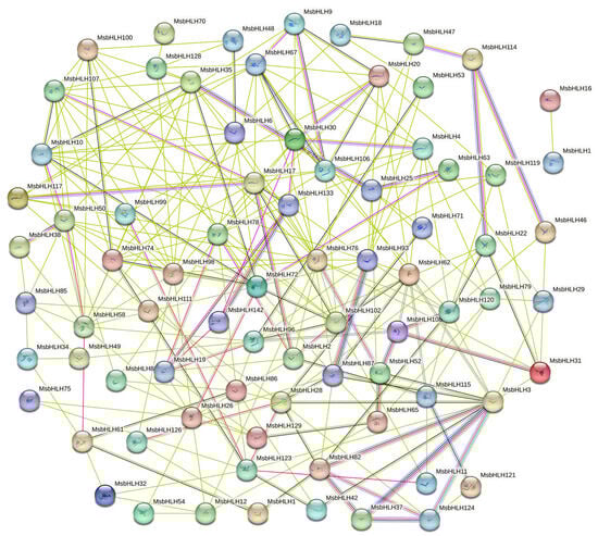 Prediction of protein interaction networks based on homologous proteins of Arabidopsis thaliana by STRING website (Figure 7). It was found that there were 82 nodes with 252 edges in the MsbHLH protein interaction network. Some proteins showed direct interactions with other proteins, such as MsbHLH70 and MsbHLH128. MsbHLH132 and MsbHLH16 only had interactions with each other and did not interact with other MsbHLH proteins. Others showed more complex interactions, which were radially connected to other nodes, such as MsbHLH93, MsbHLH3, MsbHLH78, etc., illustrating the diverse functions of MsbHLH proteins. Table S5 demonstrates the detailed information of MsbHLH proteins compared with AtbHLH proteins.