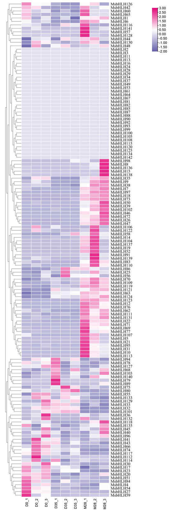 To further investigate the biological functions of MsbHLH genes in M. sieboldii, GO annotation (Table S7) and enrichment analysis (Figure S2) were performed on 142 MsbHLH genes in this study. MsbHLH genes were enriched for a total of 16 molecular functions, 7 cellular components, and 112 biological processes. Among the molecular functions, it was mainly enriched in processes such as transcriptional regulatory activity, DNA-binding transcription factor activity, and small molecule binding. Among the cellular components, they were mainly enriched in nucleus, intracellular membrane-bound organelles, and intracellular anatomical structures. Of the 82 genes enriched for biological processes, all are involved in processes such as RNA biosynthesis or metabolic regulation, cellular biosynthesis or metabolism, and gene expression. The rest were enriched in processes such as active regulation of biometabolic processes, regulation of response to red or far-red light, and photomorphogenesis.