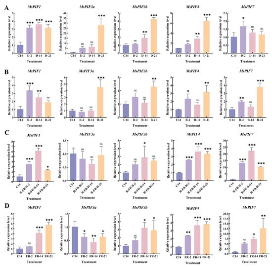 qRT-PCR analysis of MsPIFs under different light-quality treatments: (A) Under dark conditions. “C” indicates stratification. “D” indicates dark. Numbers indicate the number of days of treatment, same as below. (B) Under red light conditions. “R” indicates red light, same as below. (C) Under red-far-red-red light conditions. FR indicates far-red light, same as below. (D) Under far-red light conditions. Error lines indicate standard deviation. “ns” indicates no significant difference. Asterisks indicate significant differences in transcript levels compared with 14 d of stratification. (* p < 0.05, ** p < 0.01, *** p < 0.001).