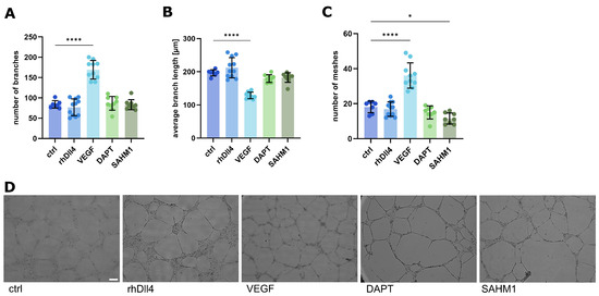 Changes in tube structures after chemical influence of the Notch signaling pathway. (A–C) Analysis of tube structures after the tube formation assay with HUVEC cells. Tube formation was influenced by the addition of the compounds listed above in the medium during cell seeding. Data from three independent experiments, each with at least triplicates, are shown in scatter plots as mean ± s.d. * p < 0.1; **** p < 0.0001 (one-way ANOVA followed by Tukey’s multiple comparison test). (A) Number of branches. (B) Average branch length in µm. (C) Number of meshes. (D) Representative images of tube structures after performing a tube formation assay; incubation for 24 h. Scale bar: 100 µm.