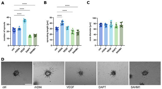 Stimulation with VEGF increased the number of sprouts (Figure 3A), but did not change the length of the single sprouts (Figure 3B). Activation of Notch signaling with rhDll4 increased the length of sprots (Figure 3B), but did not change the degree of sprouting (Figure 3A). Inhibition of Notch signaling by the inhibitors DATP or SAHM1 reduced both the sprout number and the length (Figure 3A,B). Importantly, the core diameter of the endothelial spheroids was not changed by any of the treatments (Figure 3C), indicating that the treatments did not influence proliferation or cell death. This provides clear evidence that Notch signaling plays a role in sprouting behavior in a 3D fibrous hydrogel model.