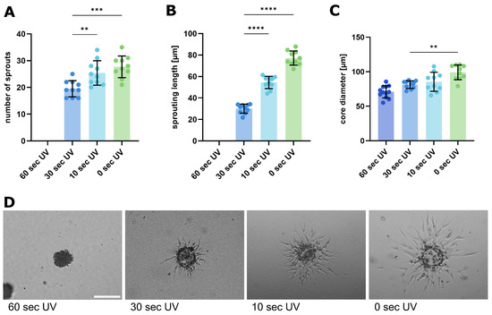 Changes in spheroid sprouting behavior after stiffness modification of the surrounding matrix. (A–C) Analysis of sprouting behavior after spheroid sprouting assay with HUVEC cells. A photoinducible collagen I hydrogel was applied as a surrounding matrix. Spheroid sprouting was influenced by stiffness changes due to different exposure times to UV light as indicated above. Data from three independent experiments, each with at least triplicates, are shown in scatter plots as mean ± s.d. ** p < 0.01; *** p < 0.001; **** p < 0.0001 (one-way ANOVA followed by Tukey’s multiple comparison test). (A) Number of sprouts. (B) Average sprouting length in µm. (C) Core diameter of the spheroid bodies. (D) Representative images of spheroids after performing a spheroid sprouting assay; incubation for 24 h. Scale bar: 100 µm.
