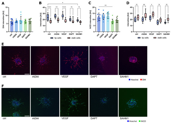Expression of Dll4 and NICD in sprouted spheroids after the chemical influence of the Notch signaling pathway. (A–D) Notch ligand (Dll4) and receptor (NICD) intensities (a.u. arbitrary units) in sprouted HUVEC spheroids. Spheroid sprouting was influenced by the addition of the compounds listed above in the medium during spheroid embedding. Intensities were analyzed in the complete spheroid (overall) as well as single cells (tip and stalk cells). (A) Overall Dll4 intensity. Data from three independent experiments, each with at least triplicates, are shown in a scatter plot as mean ± s.d. (B) Dll4 intensities in tip and stalk cells shown in a violin plot as min to max. * p < 0.1; ** p < 0.01; **** p < 0.0001; ns, not significant (one-way ANOVA followed by Šídák’s multiple comparisons test). (C) Overall NICD intensity. Data from three independent experiments, each with at least triplicates, are shown in a scatter plot as mean ± s.d. ** p < 0.01 (one-way ANOVA followed by Tukey’s multiple comparison test). (D) NICD intensities in tip and stalk cells shown in a violin plot as min to max. * p < 0.1; ** p < 0.01; ns, not significant (one-way ANOVA followed by Šídák’s multiple comparisons test). (E,F) Representative images of sprouted spheroids; incubation for 24 h. Cells are stained for nuclei (blue) and Dll4 (red) or NICD (green). Scale bar: 100 µm.