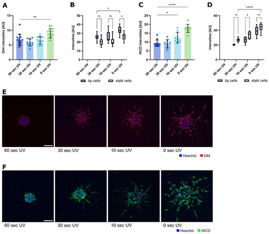 Expression of Dll4 and NICD in sprouted spheroids after stiffness modification of the surrounding matrix. (A–D) Notch ligand (Dll4) and receptor (NICD) intensities (a.u. arbitrary units) in sprouted HUVEC spheroids. A photoinducible collagen I hydrogel was applied as a surrounding matrix. Spheroid sprouting was influenced by stiffness changes due to different exposure times to UV light as indicated above. Data from three independent experiments, each with at least triplicates, are shown in a scatter plot as mean ± s.d. ** p < 0.01 (one-way ANOVA followed by Tukey’s multiple comparison test). (B) Dll4 intensities in tip and stalk cells shown in a violin plot as min to max. * p < 0.1; ns, not significant (one-way ANOVA followed by Šídák’s multiple comparisons test). (C) Overall NICD intensity. Data from three independent experiments, each with at least triplicates, are shown in a scatter plot as mean ± s.d. * p < 0.1; **** p < 0.0001 (one-way ANOVA followed by Tukey’s multiple comparison test). (D) NICD intensities in tip and stalk cells shown in a violin plot as min to max. * p < 0.1; **** p < 0.0001; ns, not significant (one-way ANOVA followed by Šídák’s multiple comparisons test). (E,F) Representative images of sprouted spheroids; incubation for 24 h. Cells are stained for nuclei (blue) and Dll4 (red) or NICD (green). Scale bar: 100 µm.
