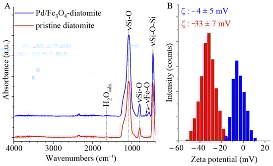 Characteristic infrared vibrational peaks of the catalyst were determined by FTIR. The characteristic absorption bands of the Si–O–Si bonds of the pure, dried diatomaceous earth were identified at 1075, 798, and 459 cm−1 (Figure 1A) which are attributed to antisymmetric stretching, symmetric stretching, and bending modes, respectively, in diatomite [,]. In addition, a small absorption band at 1639 cm−1 can be assigned to O–H deformation of adsorbed water molecules []. The pristine and the palladium and magnetite decorated diatomite samples were dispersed in distilled water, and their zeta potential values were measured (Figure 1B). In the case of pristine diatomite, the average zeta potential was −33 ± 7 mV, which is sufficiently negative to maintain electrostatic stability of the aqueous dispersion. Due to this negative zeta potential, the diatomite is readily dispersible in distilled water, allowing the entire surface of the diatomite particles to be impregnated with iron(III) citrate solution, thus allowing the formed magnetic particles to be evenly distributed on the surface of the silica. The diatomite-supported catalyst was also tested, its zeta potential (−4 ± 5 mV) being shifted toward positive values compared to that of the pristine support (Figure 1B).