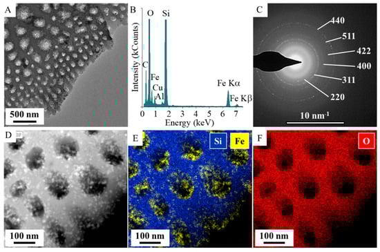 The TEM picture shows the surface of the support being richly covered by nanoparticles, which are concentrated mainly in the pores. This is also supported by the elemental maps (Figure 3A,D,E). On the energy-dispersive X-ray spectrum (EDS), in addition to the constituents of diatomite (oxygen, silicon, and aluminum), iron was also identified due to the presence of the magnetic nanoparticles (Figure 2B). Selected area electron diffraction (SAED) measurements confirmed that the diffraction pattern of the nanoparticles on the diatomite surface is consistent with the reflections typical of Fe3O4 crystallites (Figure 2C). The SAED results correlate well with the results of the XRD measurements.