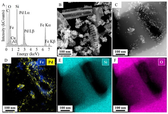 EDS (A), HAADF TEM picture (B,C), and elemental maps (D–F) of the palladium and magnetite-coated diatomite.