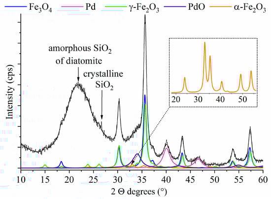 To identify the crystalline phases in the catalyst, XRD measurement was carried out (Figure 5). After Rietveld refinement of the X-ray diffractogram, reflections at 2θ values 18.3°, 30.2°, 35.6°, 43.3°, 53.7°, and 57.2° were found, which are characteristic to the (111), (220), (311), (400), (422), and (511) Miller-indexed Bragg peaks of the magnetite, respectively (PDF 19-629). However, in addition to magnetite, there is also a magnetic iron oxide phase, namely maghemite (γ-Fe2O3) in the sample with its characteristic reflections at 15.0° (110), 18.3° (111), 23.9° (210), 26.1° (211), 30.3° (220), 35.7° (311), 43.4° (400), 53.8° (422), and 57.4° (511) two theta degrees (PDF 39-1346). A small amount of hematite (α-Fe2O3, 2.23 wt%) also can be found on the diatomite surface with reflections at 33.1° and 35.4° two theta degrees (PDF 33-0664). The magnetite, maghemite, and hematite content of the catalyst are 20.9, 22.1, and 2.20 wt%, respectively. Figure 3 shows reflexions at 24.1° (101), 33.0° (210), 35.5° (110), 35.4° (311), 40.6° (511), 49.1° (702), and 53.9° (811) corresponding to the hematite phase, which is present in the catalyst only in a small amount (2.21 wt%) (PDF 33-0664). The (111) and (200) reflections of the elemental palladium are located at 40.1° and 46.5° two theta degrees, respectively. The Pd content of the catalyst is 4.40 wt% (PDF 46-1043). However, in addition to palladium, we also detected the presence of a palladium(II) oxide phase (3.31 wt%), with the corresponding (101), (110), and (112) reflections at 34.0°, 42.5°, and 54.9° two theta degrees, respectively (PDF 85-0713). Based on the results of the XRD analysis, it can be concluded that, in the prepared catalyst, the diatomite is in amorphous form with 47.1 wt%. A wide peak on the diffractogram in the area of approx. 15–24° two theta refers to amorphous SiO2 []. The composition is summarized in Table 1.
