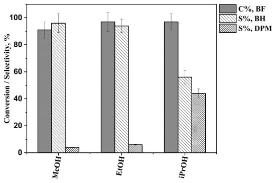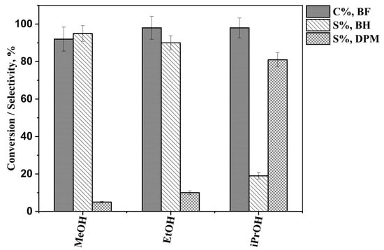 Benzophenone conversions (C%, BF), benzhydrol selectivities (S%, BH), and diphenylmethane selectivities (S%, DPM) in different solvents, after 80 min of reaction time.