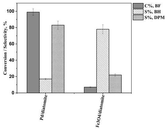Benzophenone conversions (C%, BF), benzhydrol selectivities (S%, BH), and diphenylmethane selectivities (S%, DPM) in isopropanol, using only Pd or only Fe3O4 on the diatomite support, after 240 min of reaction time.