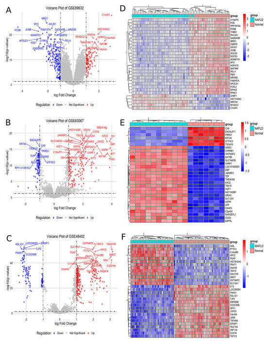 Analysis of the GSE89632 dataset identified 129 upregulated and 249 downregulated genes in the MAFLD group compared to the Normal group (Figure 1A). The top 30 significantly differentially expressed genes (DEGs) were visualized in a heatmap (Figure 1D). Similarly, analysis of the GSE63067 dataset revealed 232 upregulated and 122 downregulated genes in MAFLD, with corresponding volcano plots (Figure 1B) and a heatmap of the top 30 DEGs (Figure 1E). In the GSE48452 dataset, 288 genes were upregulated and 118 were downregulated in MAFLD, as illustrated by volcano plots (Figure 1C) and a heatmap of the top 30 DEGs (Figure 1F). Comprehensive lists of DEGs are provided in Supplementary Materials, Tables S1–S3.