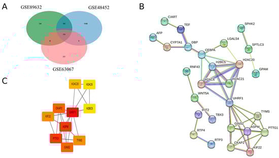 Hub genes were identified by the construction of the PPI network. (A) Venn diagrams of upregulated genes in the three GEO databases. (B) Protein interactions of upregulated genes common to MAFLD group and Normal group. (C) The 10 hub genes with the highest scores in the up-regulated differential genes in MAFLD versus normal tissue.
