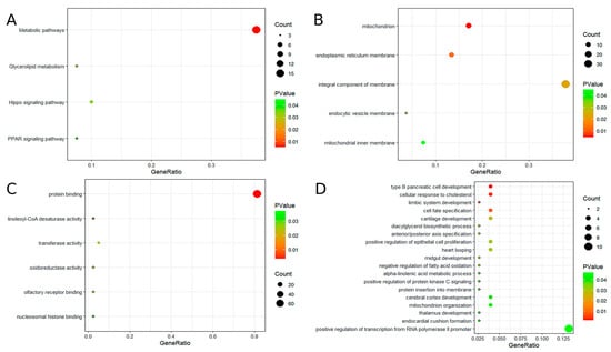 To further explore the potential functions of the 10 hub genes, GO and KEGG analyses were performed. GO analysis indicated that these genes are primarily involved in the development of type B pancreatic cells, cellular response to cholesterol, mitochondrial and endoplasmic reticulum membrane functions, protein binding, linoleic acid-CoA desaturase activity, and other related biological processes. KEGG pathway analysis revealed significant enrichment in several metabolic pathways, including glycerol ester metabolism, the hippocampal signaling pathway, and the peroxisome proliferator-activated receptor (PPAR) signaling pathway. For additional details, please refer to Figure 3.