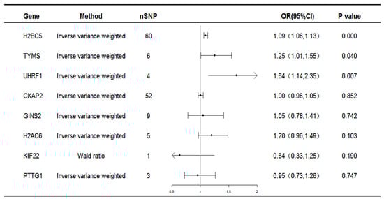 A search of the eQTLGen database for cis-eQTL data related to the 10 hub genes yielded results for only eight genes, as H2A clustered histone 20 (H2AC20) and assembly factor for spindle microtubules (ASPM) were not included in the database. MR analysis was performed on the eight identified hub genes. SNPs located within 1 Mb of the TSS and meeting an FDR threshold of less than 0.05 were selected as IVs, resulting in the identification of 9260 SNPs. All selected SNPs satisfied the three fundamental assumptions of MR and demonstrated F-statistics greater than 10 (for detailed information, refer to Supplementary Materials, Table S3). PhenoScanner analysis confirmed that none of the selected SNPs were associated with potential confounding factors.