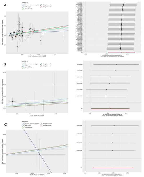 Scatter plots and leave-one-out forest maps of the 5MR models for three genes with potential causal relationships with MAFLD: (A) H2BC5, (B) TYMS, and (C) UHRF1. MR, Mendelian randomization; SNP, single-nucleotide polymorphism.