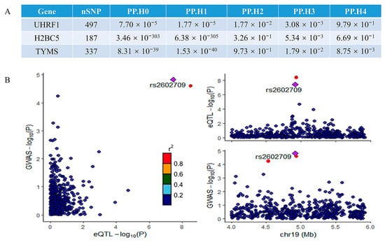 The results of the colocalization analysis: (A) the results of the colocalization analysis for all three potential genes; (B) the results of colocalization visualization of the significant gene UHRF1. The r2 value indicates the linkage disequilibrium (LD) between the variants and the top SNPs.