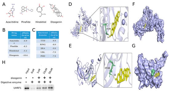 UHRF1 was identified to contain five distinct domains. Molecular docking analyses were performed with disogenin using each of these five domains individually. The protein crystal structures of the UHRF1 domains were retrieved from the Protein Data Bank (PDB) (http://www.rcsb.org/pdb/home/home.do (accessed on 15 April 2024)) (PDB: 3ASL, PDB: 3FL2, PDB: 6W92, PDB: 2FAZ, and PDB: 3BI7). As shown in Figure 7C, the TDD domain exhibited the lowest binding energy. The results indicated that disogenin binds to the SRA domain of both the full-length UHRF1 protein (Figure 7D–F) and the segmental UHRF1 protein (Figure 7E–G). The consistency between the two molecular docking outcomes supports the reliability of the findings. To further validate the interaction between disogenin and UHRF1, we employed the DARTS assay. The results demonstrated that UHRF1 exhibited increased resistance to proteolysis in the presence of disogenin (Figure 7H), suggesting a direct binding interaction between disogenin and UHRF1. Based on these findings, disogenin was selected as the primary focus for further investigations.