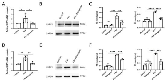 Disogenin reduced the levels of mRNA and protein of UHRF1. (A,B) The mRNA and protein levels of UHRF1 in AML12 cells. (C) The levels of TG and TC in AML12 cells. (D,E) The mRNA and protein levels of UHRF1 in HepG2 cells. (F) The levels of TG and TC in HepG2 cells. * p < 0.05, ** p < 0.01, *** p < 0.001, and **** p < 0.0001.
