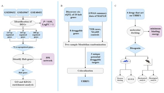 Metabolic-associated fatty liver disease (MAFLD) is a chronic liver condition with limited therapeutic options. To identify novel drug targets, we integrated bioinformatics, Mendelian randomization (MR), and colocalization analyses. Using the Gene Expression Omnibus (GEO) database, we identified differentially expressed genes and constructed protein–protein interaction (PPI) networks, pinpointing 10 hub genes. MR and colocalization analyses revealed that Ubiquitin-like with PHD and ring finger domains 1 (UHRF1) is causally associated with MAFLD and driven by the same causal variant locus, suggesting its potential as a therapeutic target. Molecular docking identified disogenin as a candidate small-molecule drug targeting UHRF1. Drug affinity responsive target stability (DARTS) assays confirmed direct binding between UHRF1 and disogenin. In vitro, disogenin significantly reduced UHRF1 mRNA and protein levels induced by free fatty acids (FFA) in AML12 and HepG2 cells, accompanied by decreased cellular total cholesterol (TC) and triglyceride (TG) levels. In vivo, disogenin administration alleviated hepatic lipid accumulation, inflammation, and fibrosis in methionine/choline-deficient (MCD)-diet-fed mice. This study identifies UHRF1 as a promising therapeutic target for MAFLD and validates disogenin as a potential therapeutic agent, providing a foundation for further investigation.