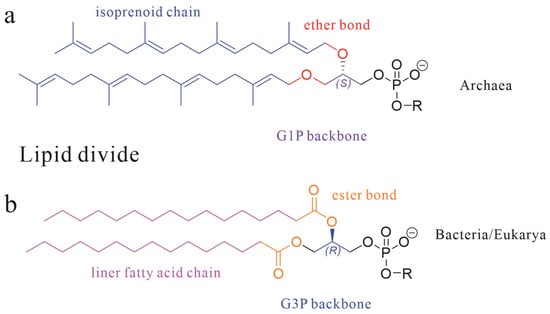 Archaea, one of the three fundamental domains of life (alongside Bacteria and Eukarya), exhibit cellular membranes that, while architecturally homologous to bacterial membranes in their amphiphilic lipid–protein framework, display profound molecular-level divergence [1,2]. Specifically, archaeal lipid characteristics can be distinguished from those of Bacteria/Eukarya through three core dimensions as shown in Figure 1: stereochemical configuration (sn-1 vs. sn-3 glycerol backbone), chemical bond type (ether vs. ester linkages), and hydrophobic unit properties (isoprenoid chains with isomerization vs. straight-chain fatty acids), collectively termed the “lipid divide” [3,4,5].
