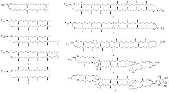 - de Rosa, M.; Gambacorta, A.; Minale, L.; Bu, J.D. Cyclic diether lipids from very thermophilic acidophilic bacteria. J. Chem. Soc. Chem. Commun. 1974, 14, 543–544. [Google Scholar] [CrossRef]