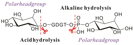 Schematic diagram of the hydrolysis of the intact polar archaeal lipids: ester bonds are hydrolyzed under alkaline conditions, and ether bonds are hydrolyzed under acidic conditions.