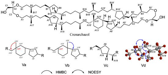 The structural elucidation of crenarchaeol, key HMBC (arrows pointing from H to C), and NOESY correlations; HMBC experiments confirmed the connectivity of its six-membered ring system (Va and Vb), and NOESY correlations established the stereochemical configuration of its cyclopentane moieties (Vc and Vd).