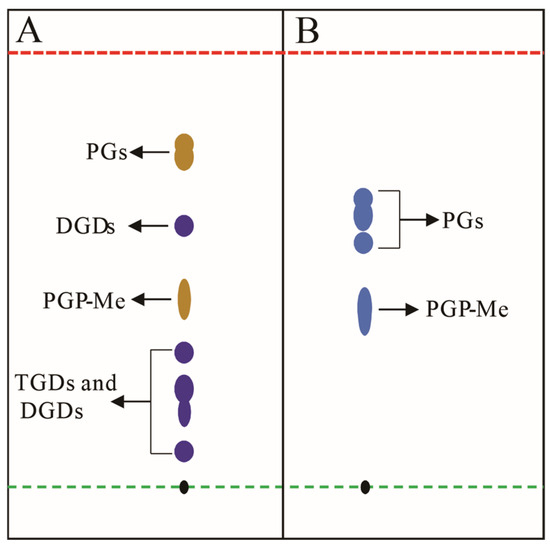Schematic diagram illustrates conceptual TLC analysis of halophilic archaeal lipid extractions; (A) lipid extract from Natronorubrum aibiense stained with 0.5% α-naphthol reagent, showing dark yellow spots corresponding to phosphatidylglycerol derivatives (PGs), and purple spots representing triglycosyl diethers (TGDs) and diglycosyl diethers (DGDs) [128]; (B) lipid extract from Haloterrigena longa stained with Zinzadze reagent, where blue spots indicate phosphatidylglycerol species (PGs) [129]. Both analyses employed chloroform/methanol/acetic acid/water (85:22.5:10:4, v/v) as the developing solvent. Black spots denote the TLC origin. Green and red dashed lines demarcate the sample application origin and solvent front, respectively. Abbreviations: PGP-Me (phosphatidylglycerol phosphate methyl ester); PGs (phosphatidylglycerols); TGDs (triglycosyl diethers); DGDs (diglycosyl diethers). Note: Rf values shown do not represent actual experimental data.