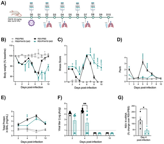 To improve the toxicity observed on body weight loss and illness in the PBS/PXQD-treated mice, we tested lower doses of the compound (5 to 15 mg/kg) for changes in body weight and viral replication. Following the same treatment schedule, we found body weight to be improved for some of the doses in PBS mice treated with PX478, but none of the RSV mice treated with PX478 had comparable antiviral activity. The administration of PX478 at 20 mg/kg was then changed to every 48 h (PXQAD) over the 10-day infection period (Figure 1A). Uninfected mice that received the compound on alternate days no longer exhibited substantial weight loss or heightened illness in comparison to the PBS/PBS control mice. However, RSV-infected mice treated with PXQAD continued to demonstrate significantly worse body weight loss and illness scores in comparison to the RSV/PBS mice, although these mice showed signs of recovery at the later stages of the disease course (Figure 1B,C).