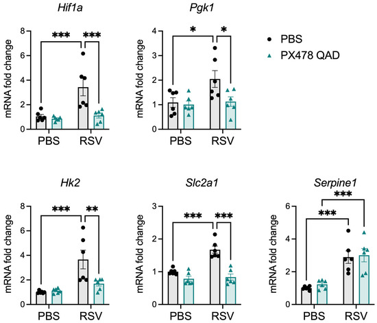 Effect of PX478 on Hif1a (HIF-1α) and HIF-associated target genes in the lungs of mice during RSV infection. Mice were euthanized at day 2 p.i., and RNA was extracted from the lung tissue. The gene expression of Hif1a; the HIF-1α targets Pgk1, Hk2, and Slc2a1 (GLUT1); and the HIF-2α target Serpine1 (PAI-1) was measured by RT-qPCR (n = 6 mice/group). Data are expressed as mean ± SEM. Significant results were determined by two-way ANOVA followed by Bonferroni’s multiple comparisons test (* p ≤ 0.05, ** p ≤ 0.01, *** p ≤ 0.001).